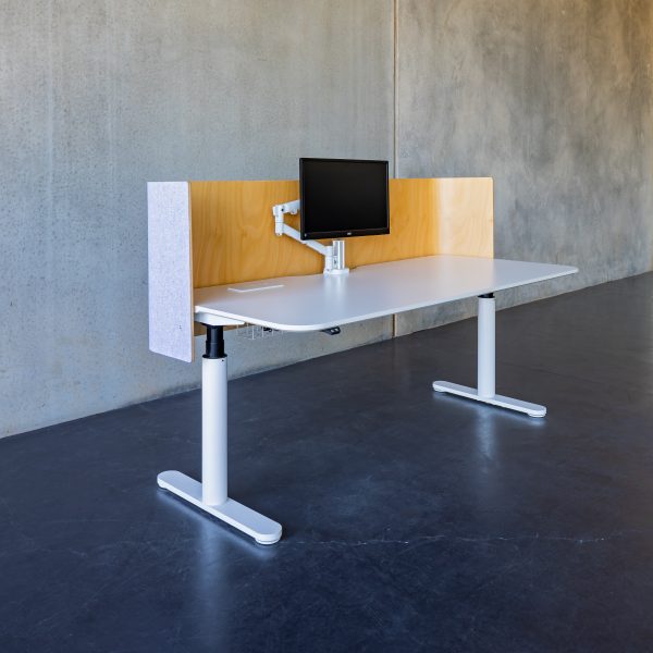 Here we showcase a single Leader with a private curved screen made from a curved ply with a felt fabric backing. Our simple Leader leg, allows for hidden cabling and comes as sit-to-stand or fixed height.