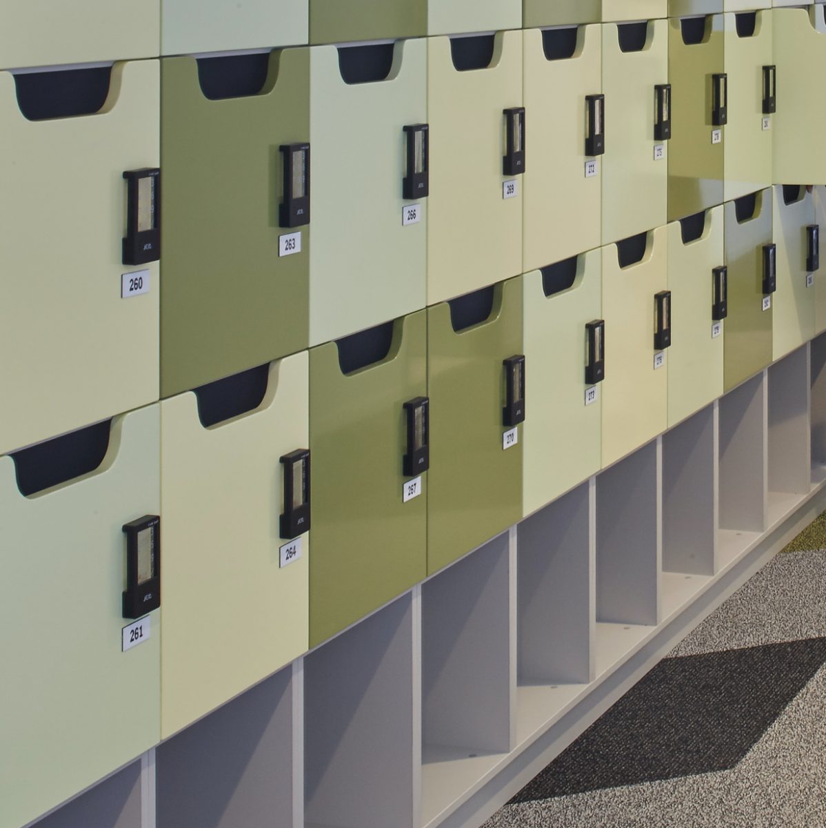 We manufacture storage out of a variety of materials such as wood, laminates, metals and ABS plastics. For the Sydney Olympic Park Authority fit out, Maxton Fox created custom lockers with keypad locking systems, manufactured a matching laminate to the interior scheme.