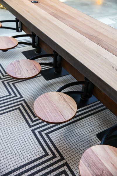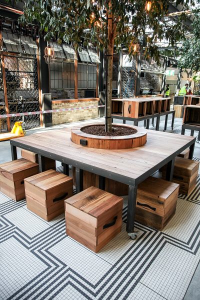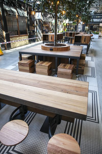 City of Sydney Mayor, Clover Moore, had a goal to turn the Harold Park Tramsheds in Glebe into an example of how to sustainably develop a region to support both new and established local communities. Tramsheds is one of Sydney’s most exciting new food destinations, and features 12 innovative food providers and seven community retailers. Developer Mirvac approached Maxton Fox to provide bespoke designs and fabrications for an industrial style of furniture featuring a raw, structural, and recycled aesthetic.