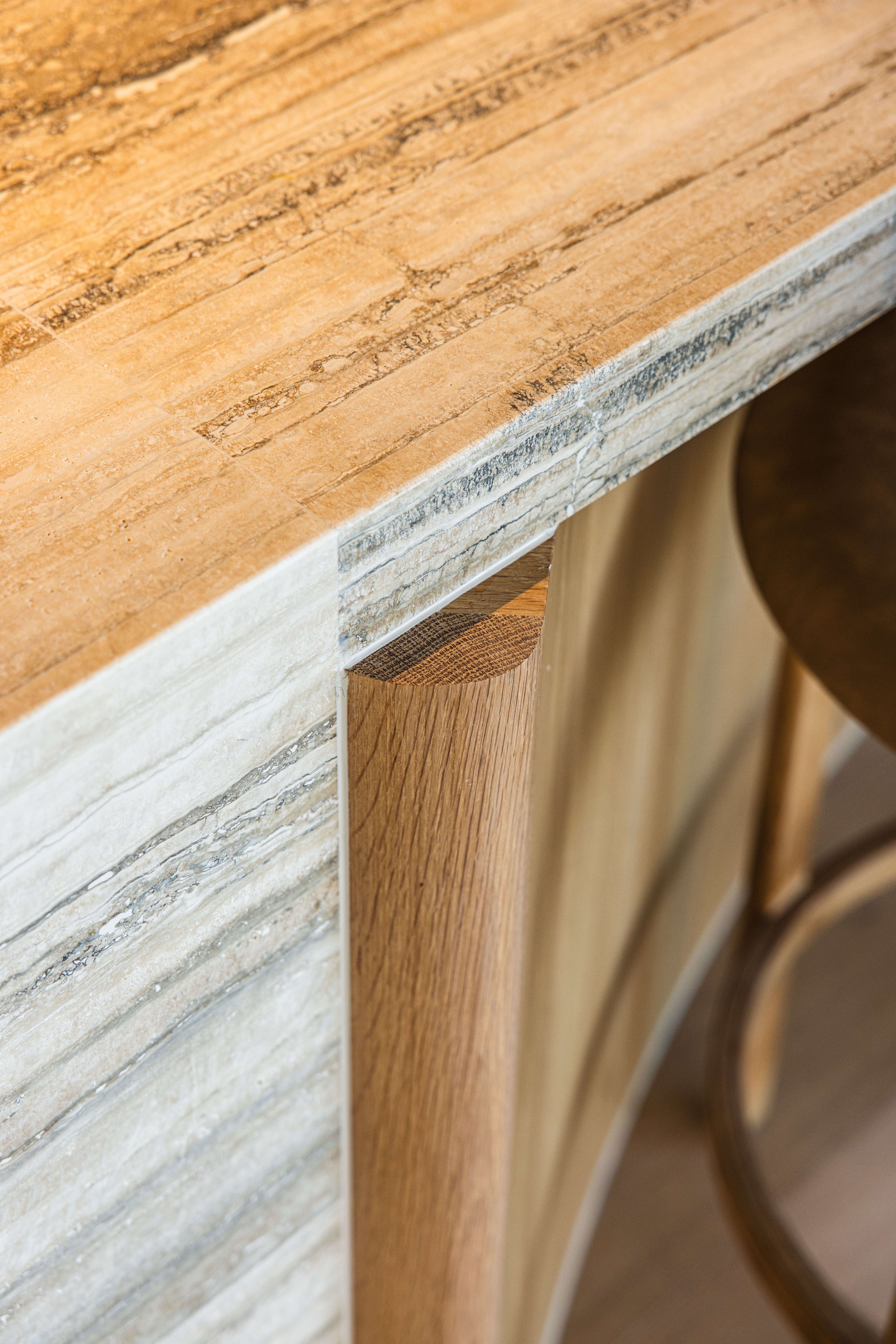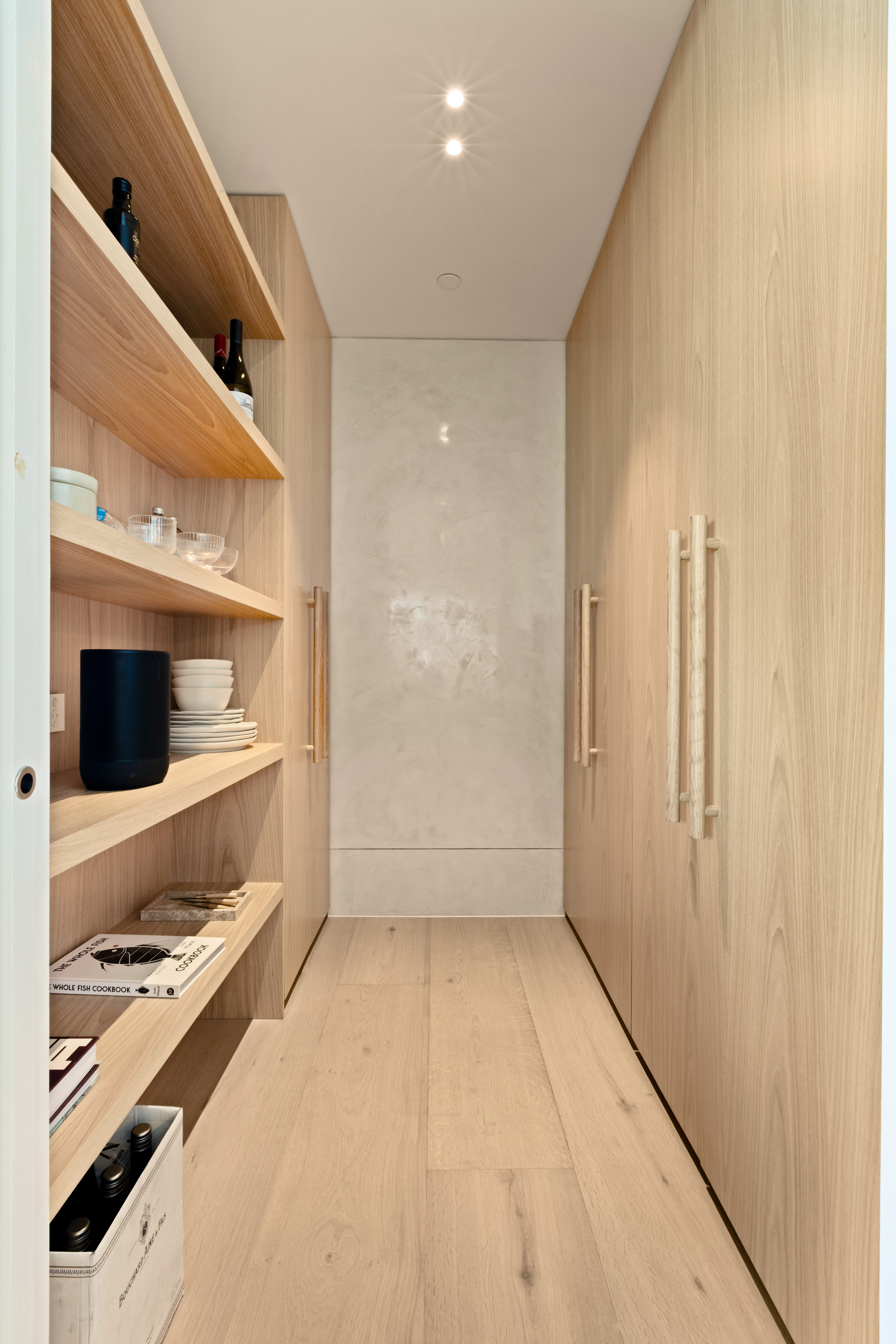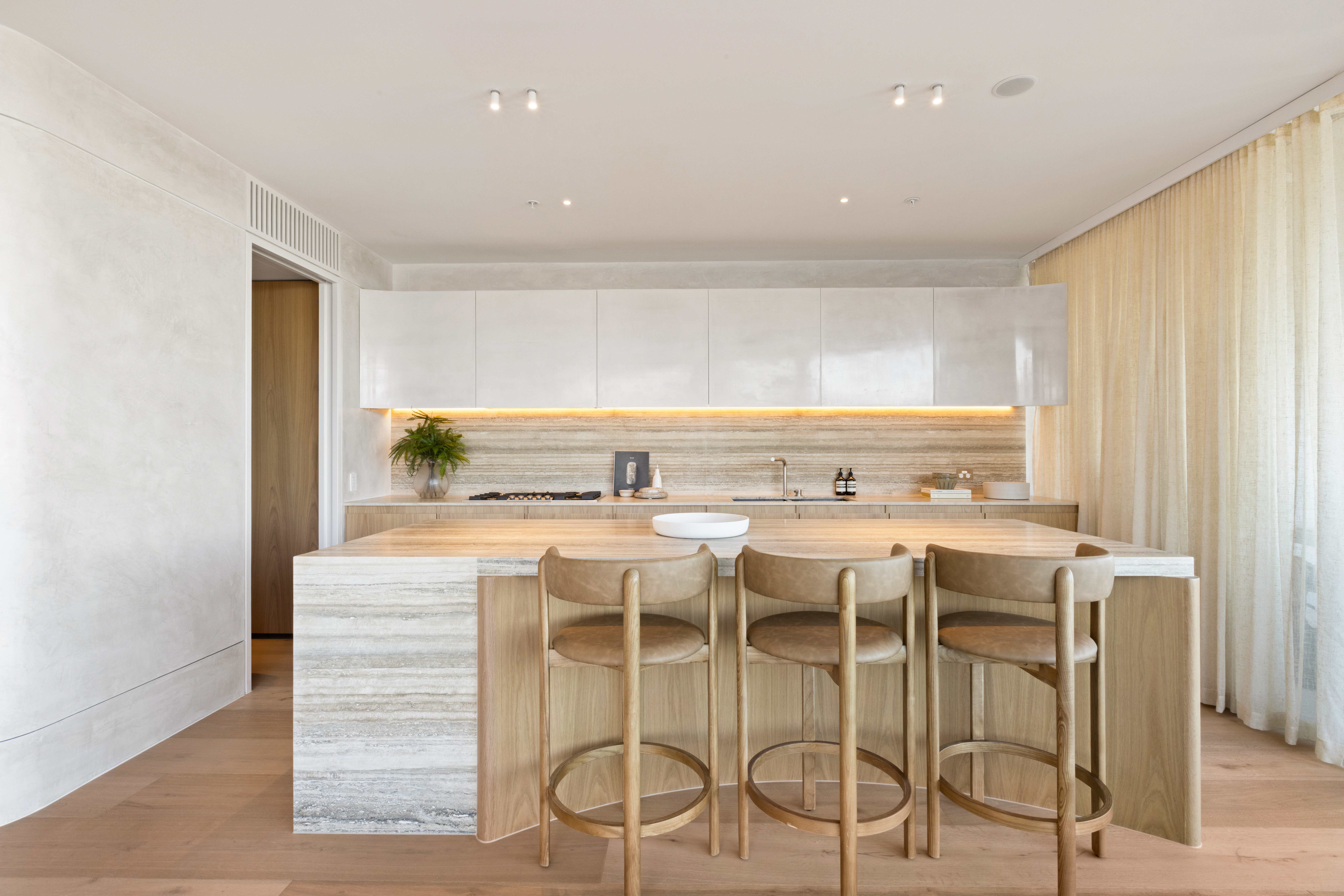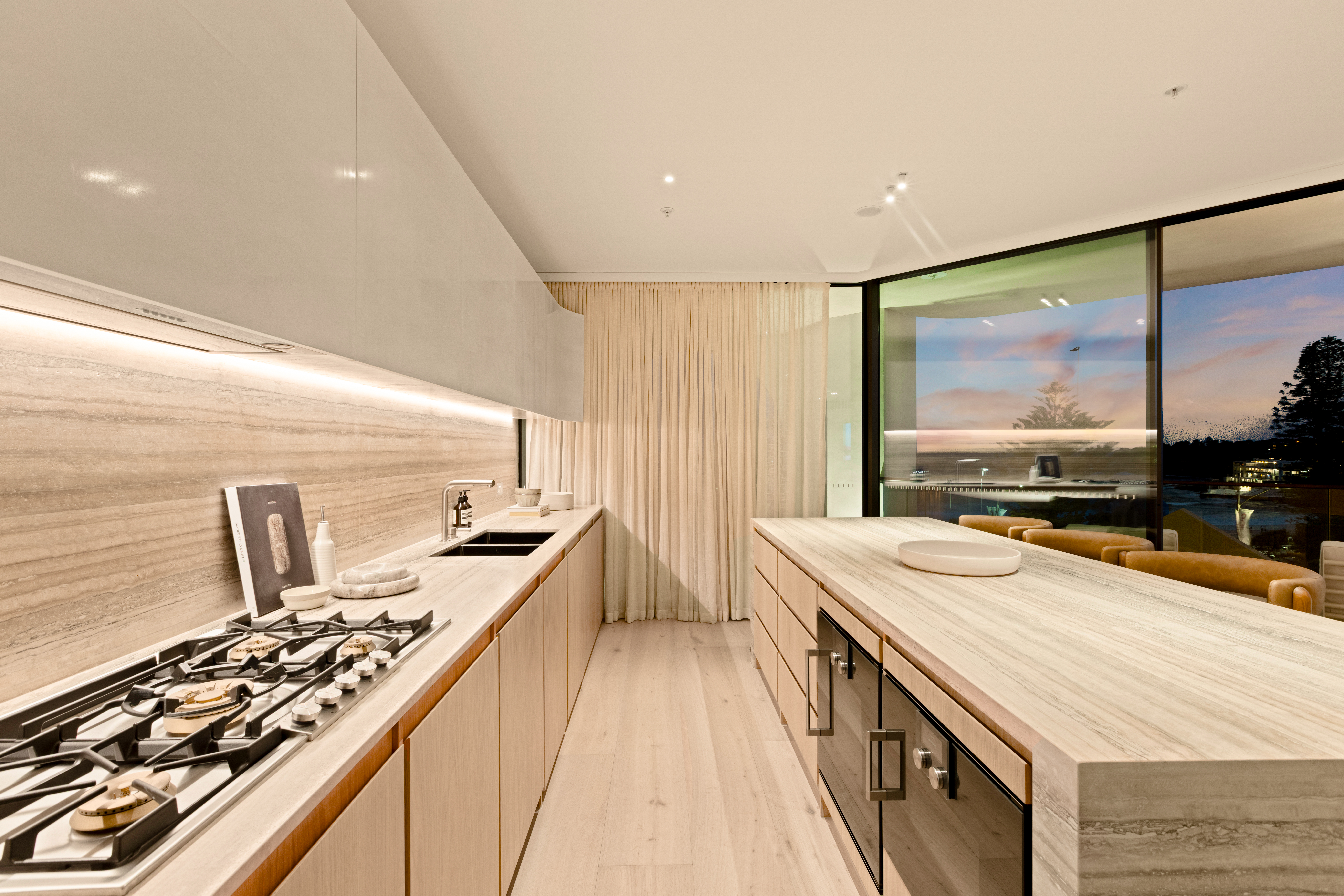 Stunning use of American white oak solid timber, and matching veneer, combined with the Travetine stone, is an understated luxurious mix that suits both the building and the surrounds of the Bondi beach landscape.