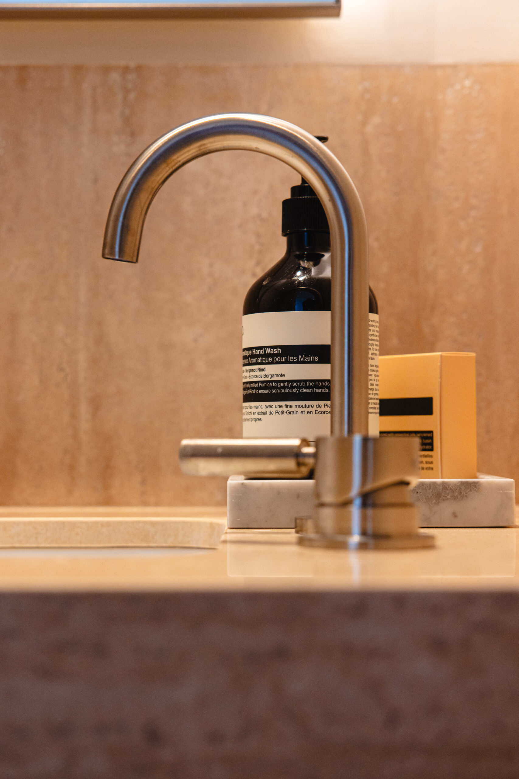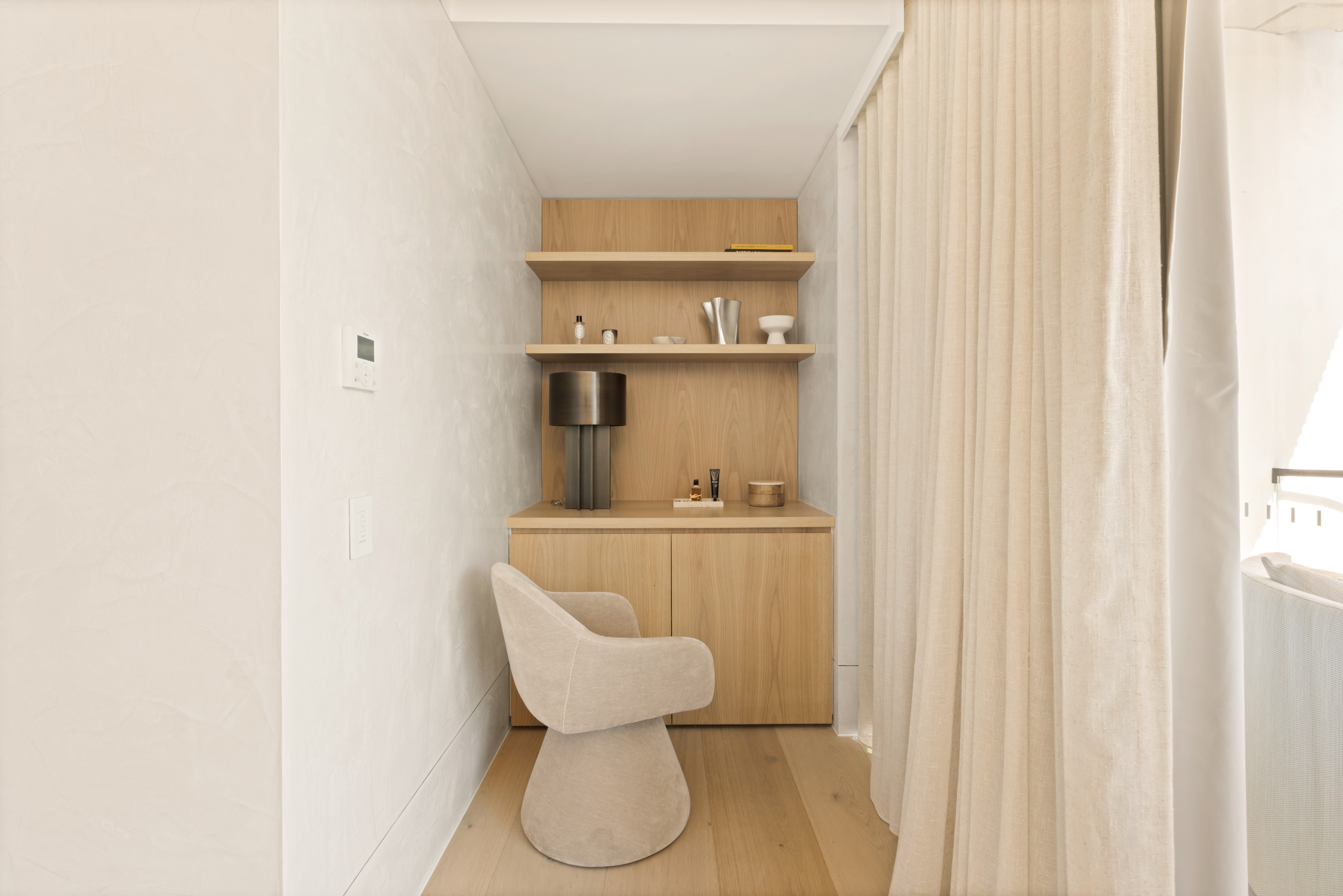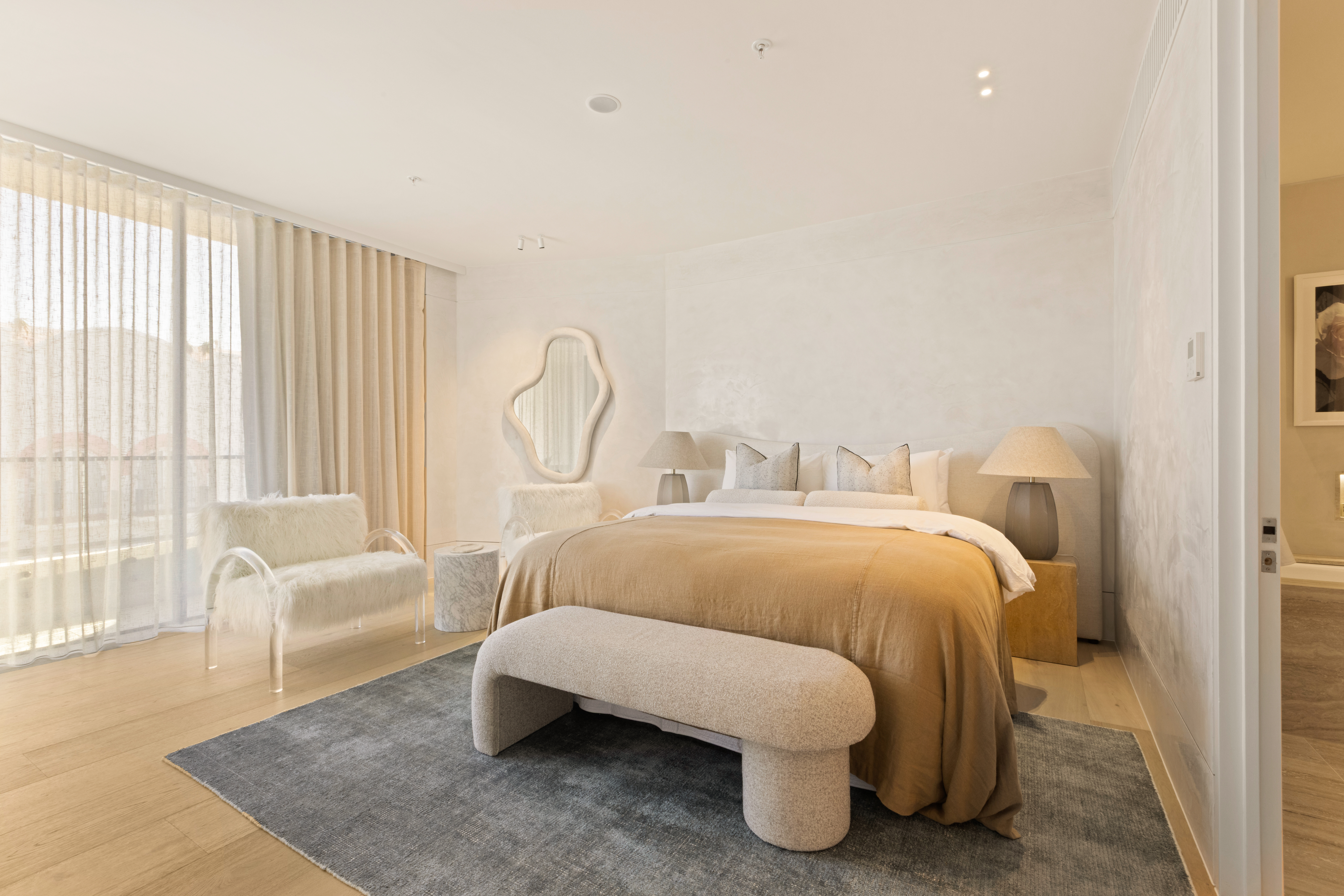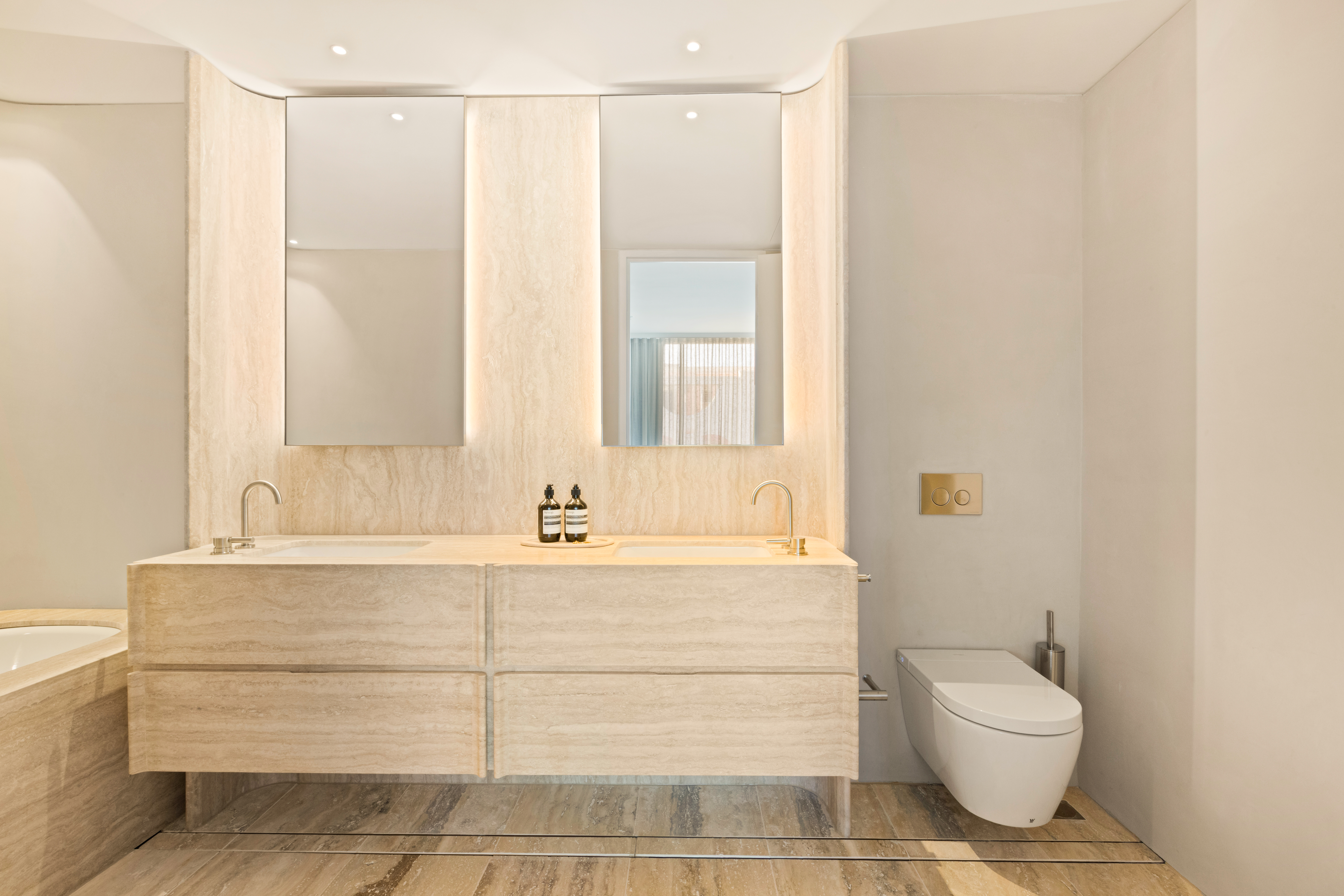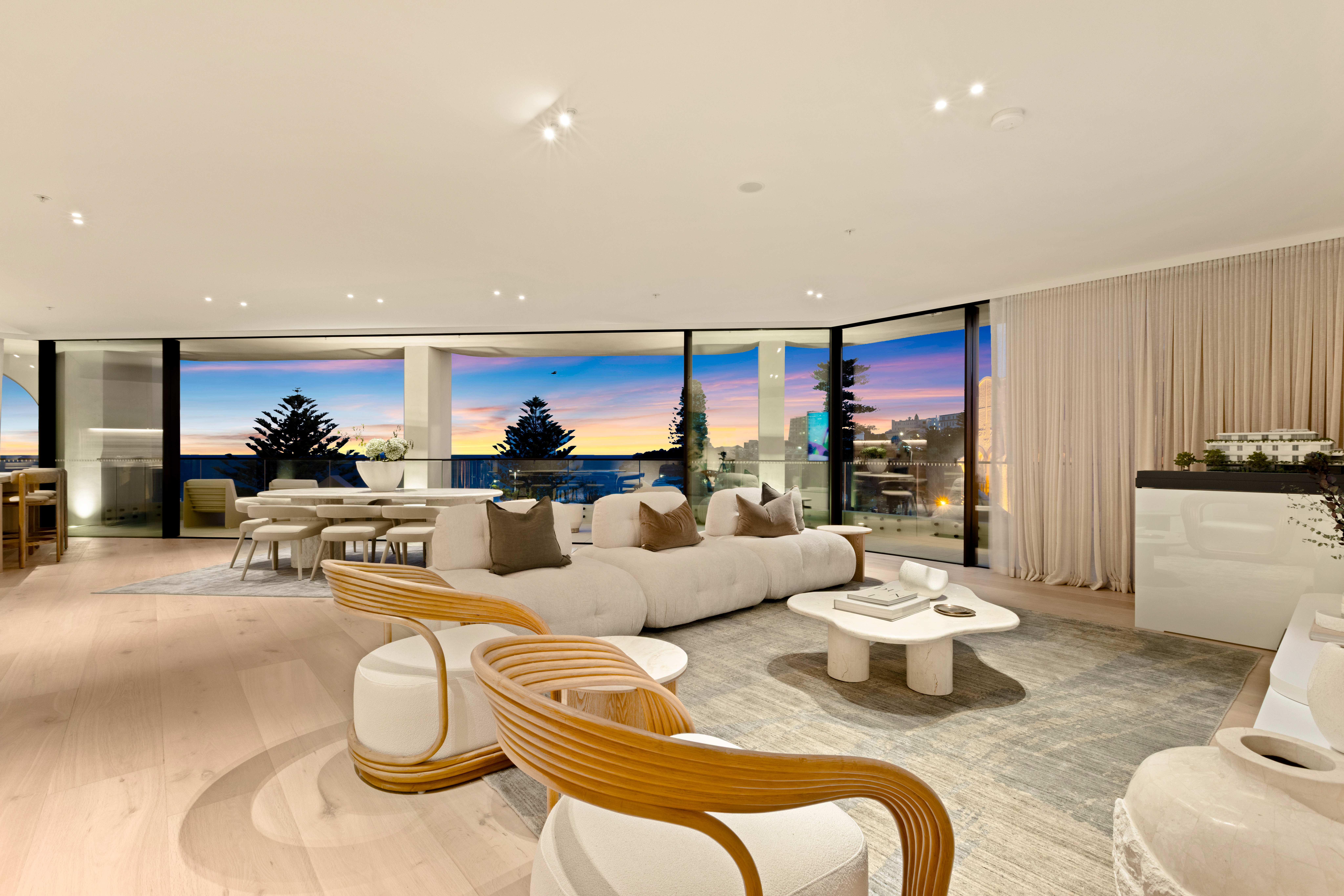 Stunning use of American white oak solid timber, and matching veneer, combined with the Travetine stone, is an understated luxurious mix that suits both the building and the surrounds of the Bondi beach landscape.