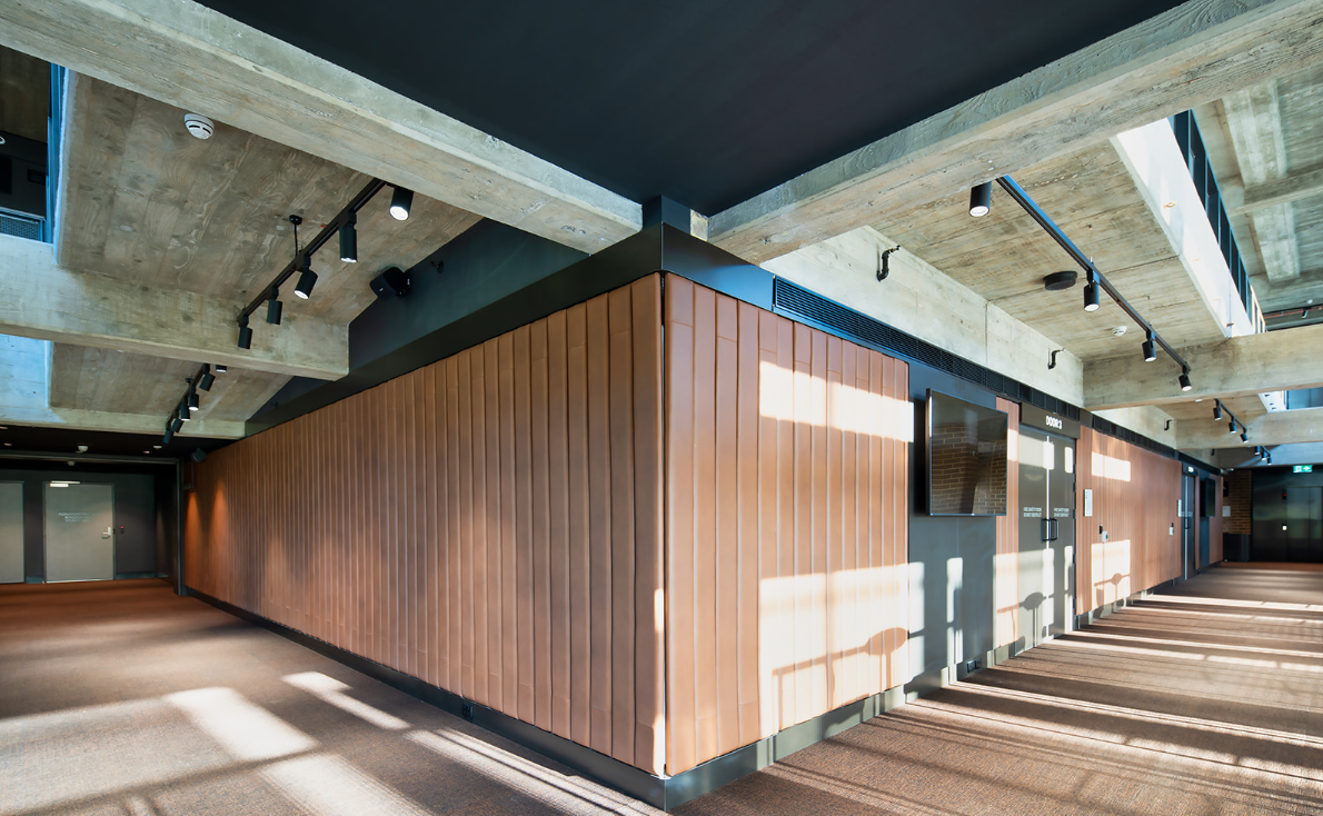 The building’s key architectural feature is a striking Glulam timber atrium, locally sourced from Victoria which provides a stunning and grand entrance to the new development.